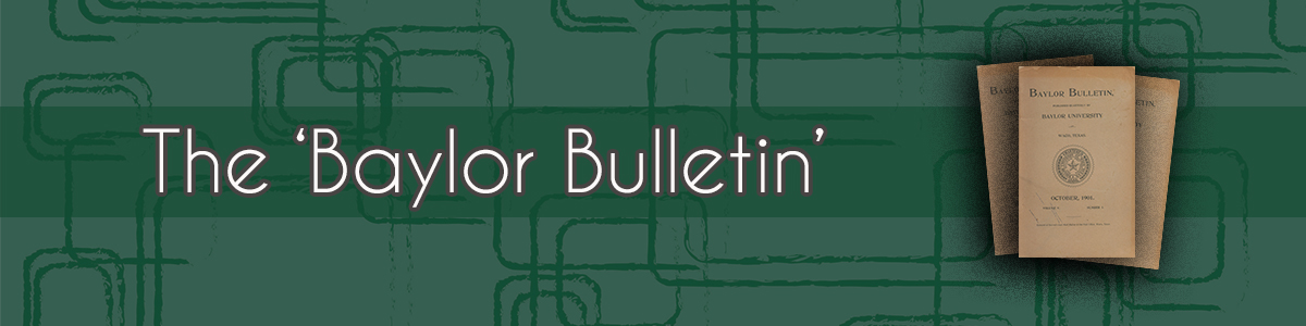 The Baylor Bulletin, also known as the university catalogue, contains information relevant to graduate and undergraduate students. Included is information on administration, admissions, policies, tuition, financial aid, course descriptions, degree requirements, academic calendar, and more. Typically divided into sections by the various colleges and schools, this resource provides a comprehensive overview of each academic year.