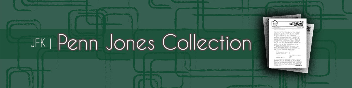 William Penn Jones, Jr. (1914-1998) was a journalist and World War II veteran best known for his research into the assassination of John F. Kennedy. Jones wrote a series of books entitled Forgive My Grief and was editor-in-chief of The Continuing Inquiry, a newsletter focused on assassination theories. This collection contains a nearly complete run of The Continuing Inquiry and is full text-searchable.