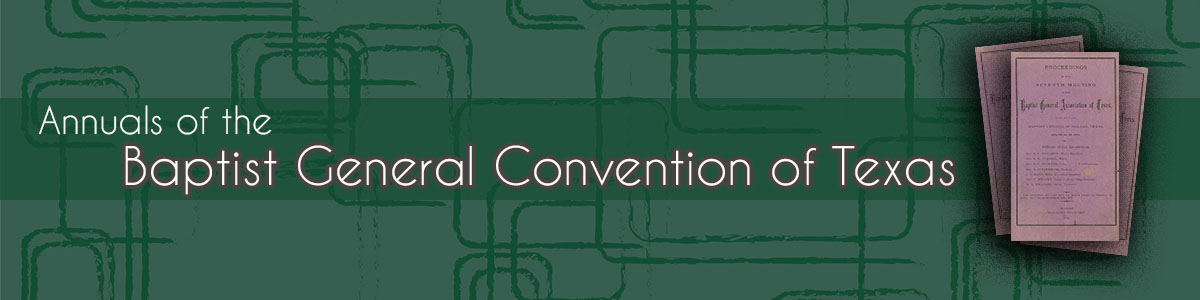 The Baptist General Convention of Texas holds copyright to all issues in all formats of the Baptist General Convention of Texas Annuals, Proceedings, and Minutes as stated in the volumes. The Texas Baptist Historical Collection provided some copies of the Proceedings, Minutes, and Annuals to Baylor University for this cooperative digitization project.
